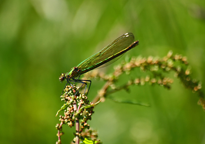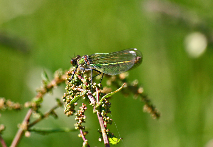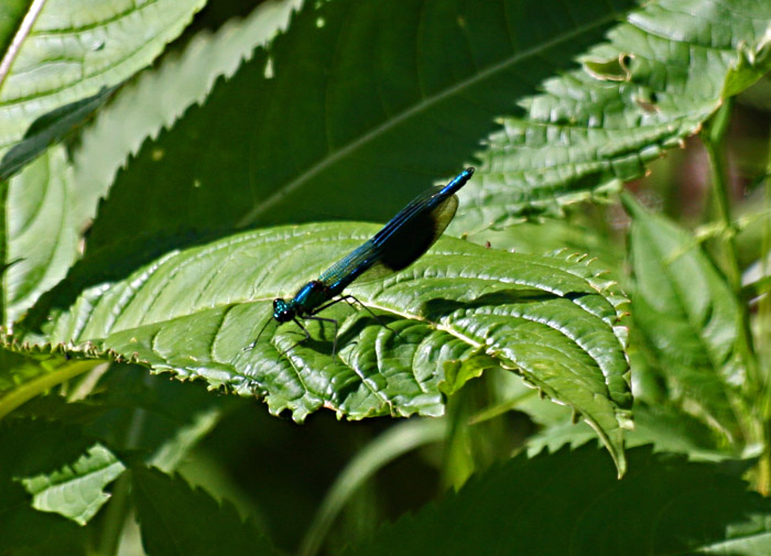 This beautiful damselfly is, I believe, Agrion splendens, a male Banded-Demoiselle Damselfly. It was near the River Trent not far from Fiskerton.